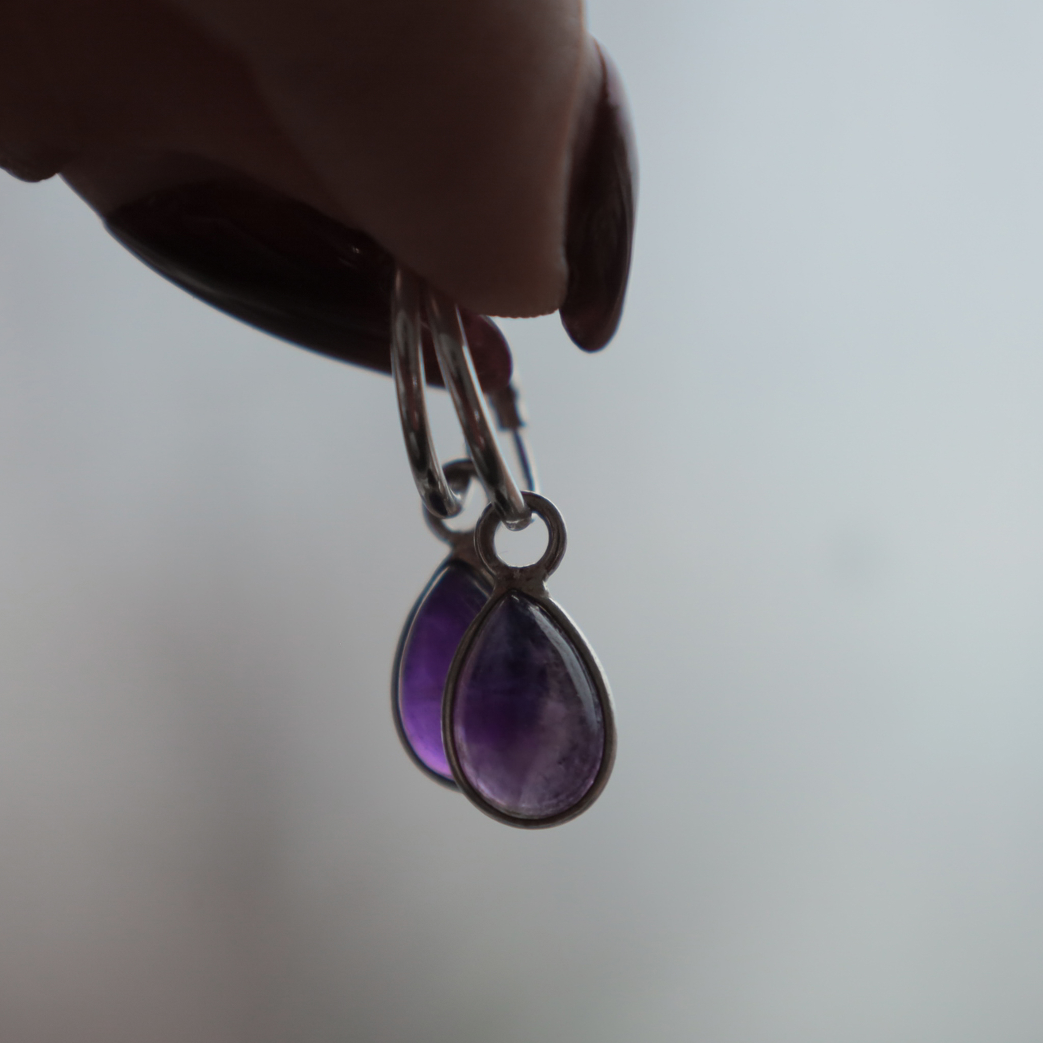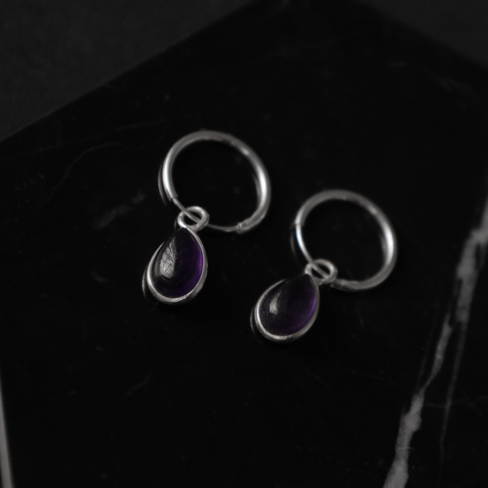 Boucles d’oreilles créoles en argent avec des améthystes en forme de gouttes