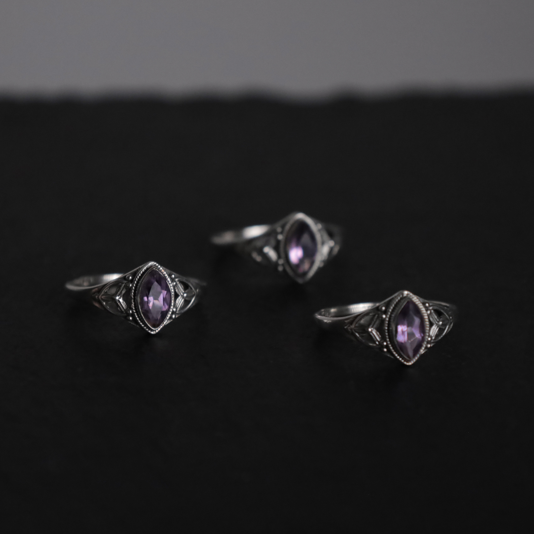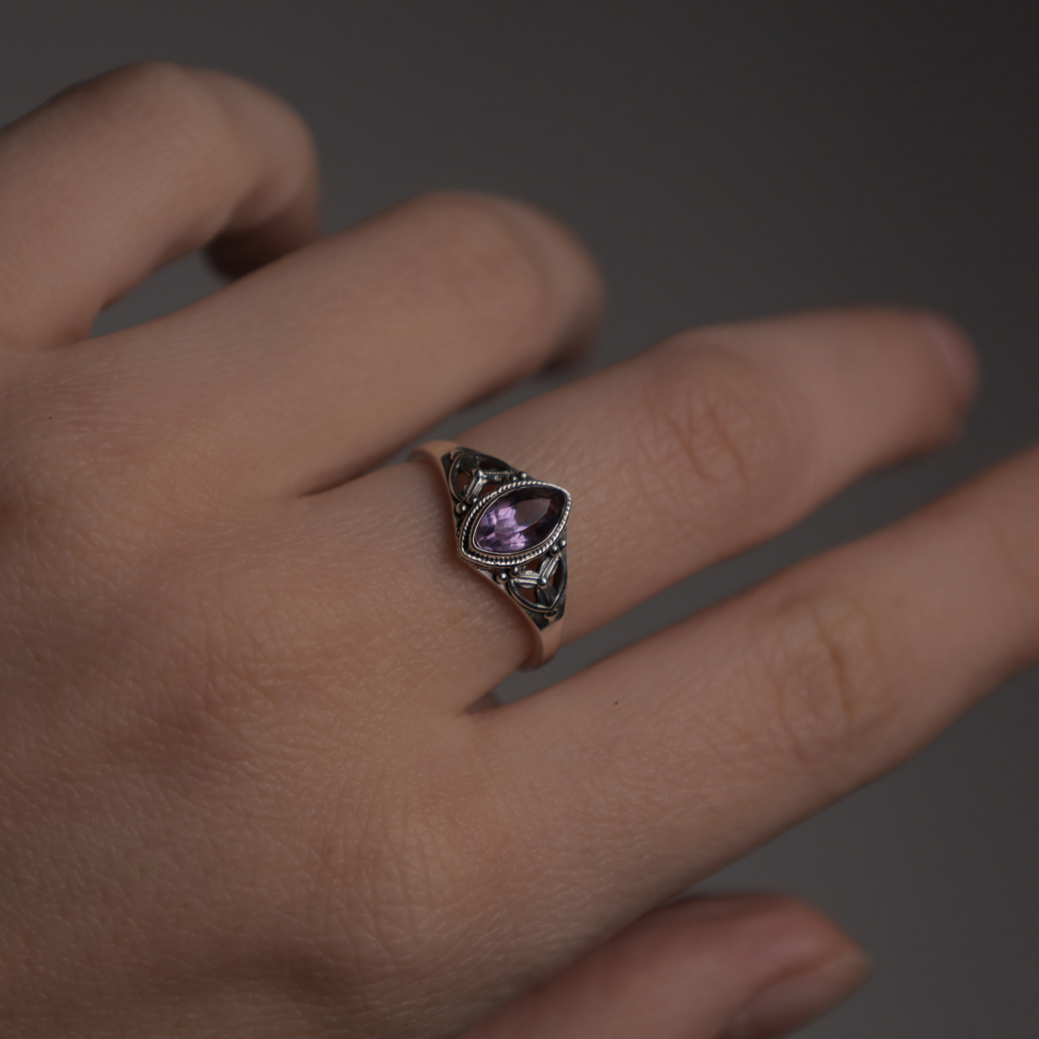 Bague délicate en argent avec améthyste facettée, style vintage.