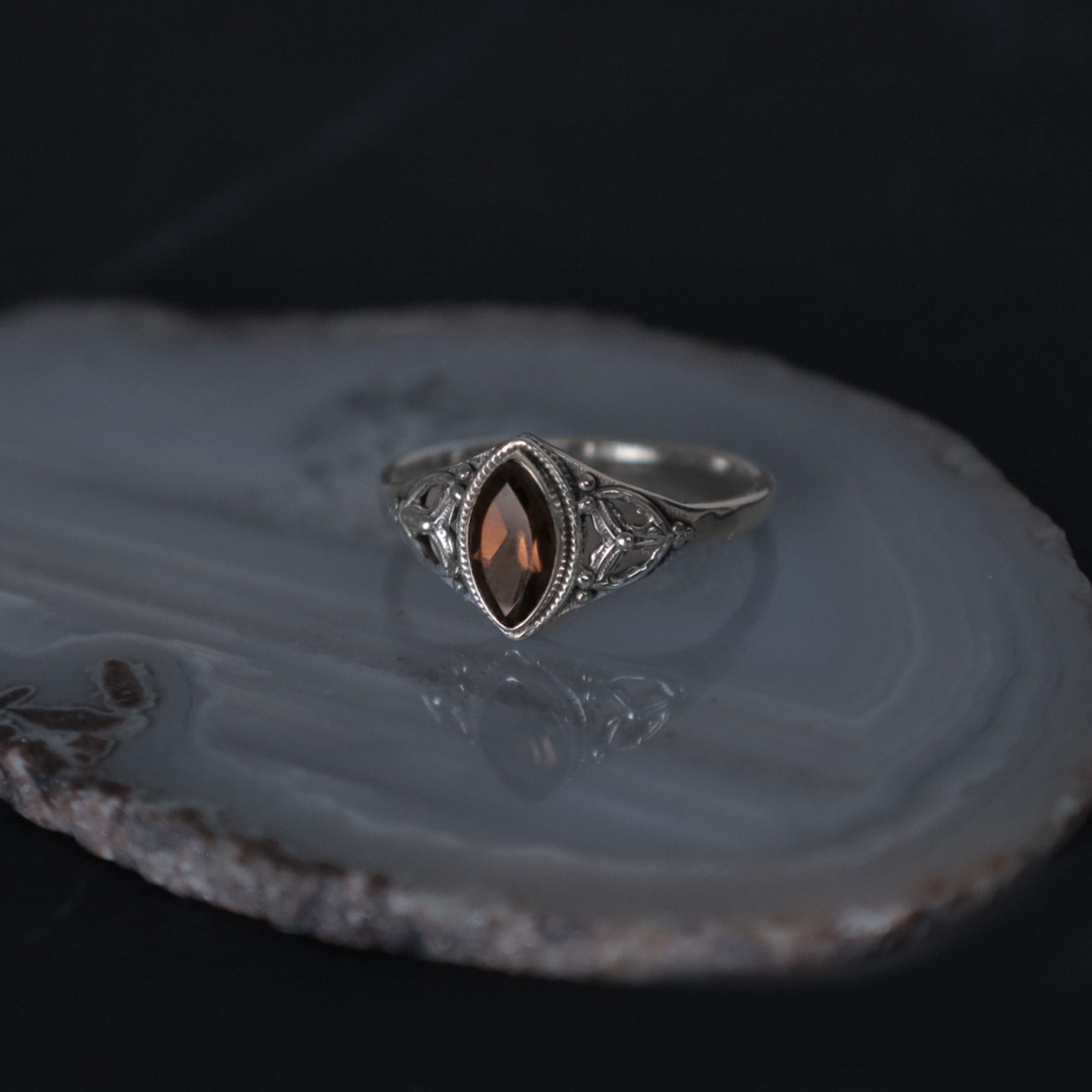 Bague en argent 925 avec quartz fumé : une profondeur chaleureuse de brun et un éclat noble qui se révèle magnifiquement à la lumière. La taille met en valeur le volume de la pierre et offre un doux jeu de nuances, du chocolat au cognac. Le quartz fumé est souvent considéré comme une pierre d’ancrage et de calme : il aide à rassembler ses pensées, à équilibrer les émotions et à garder le focus.